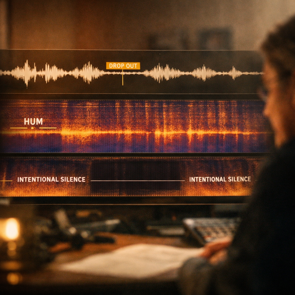 The system detects high-confidence issues such as dropouts, hum, buzz, muffling, and clicks or pops. These findings are presented as Strict Actionables a minimal list of issues that warrant attention—alongside Full Review Sheets that provide ranked, contextual insight for deeper review.